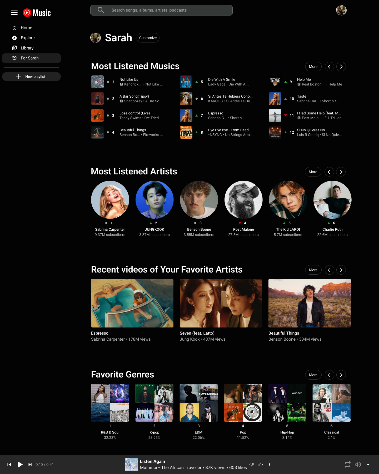 In the early stages of creating the low-fidelity wireframe, I explored a Bento-style layout to group and present content based on user interests. This approach aimed to give users a more intuitive and organized way to engage with their personalized data. For example, in the genre section, I used a donut graph to create a fun and visually engaging element—offering users an entertainment-like experience while satisfying their curiosity about their own listening patterns.